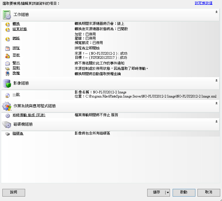按一下每個類別中的連結,為移轉工作指定所需的設定: