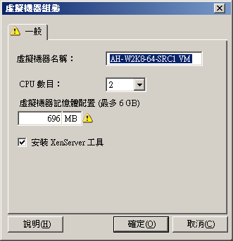 如需「虛擬機器組態」對話方塊中主機特定的目標虛擬機器組態選項,請參閱目標虛擬機器組態︰Citrix XenServer。