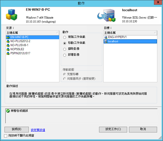在「移轉工作」視窗的「工作組態」區段,進行以下設定︰