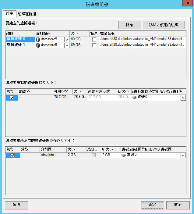在「移轉工作」視窗的「磁碟機組態」區段,進行以下設定︰
