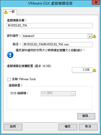 虛擬機器名稱:指定新虛擬機器的顯示名稱。 資料儲存:選取要在其中建立 *.vmx 檔案的資料儲存。 組態檔案路徑:指定虛擬機器 *.vmx 組態檔案的名稱和目錄路徑。 虛擬機器記憶體配置:指定要配置給虛擬機器的虛擬 RAM 數量值。 安裝 VMware Tools:啟用此選項可在移轉過程中安裝 VMware Tools (建議)。 SCSI 磁碟機:選取 BusLogic 或 LSIlogic (建議的選項)。 進階:按一下此按鈕可檢視或修改進階的虛擬機器組態設定。 |