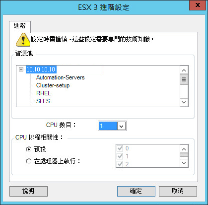 以下是低於 vSphere 5 之 VMware ESX 系統特定的組態選項。若要存取用於控制資源池、CPU 數目和 CPU 排程相關性的設定,請按一下進階。