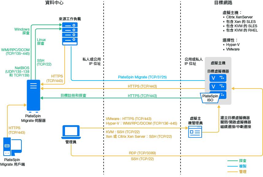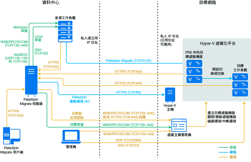 附註:圖 14-1 和圖 14-2 描述了 Windows 及 Linux 工作負載的自動探查和網路要求。您也可以使用來源工作負載上的 Migrate 代理程式來註冊工作負載,並使用 HTTPS (TCP/443) 將其庫存詳細資料傳送至 PlateSpin Migrate 伺服器。請參閱節 2.6.2, 工作負載註冊的要求 和節 22.7, 使用 Migrate 代理程式註冊工作負載並探查詳細資料。
