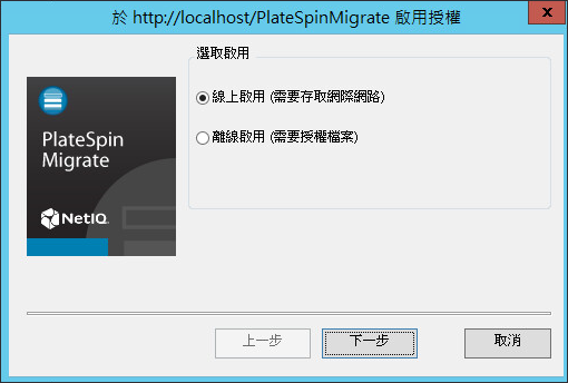 線上啟用要求 PlateSpin Migrate 用戶端具有網際網路存取權。