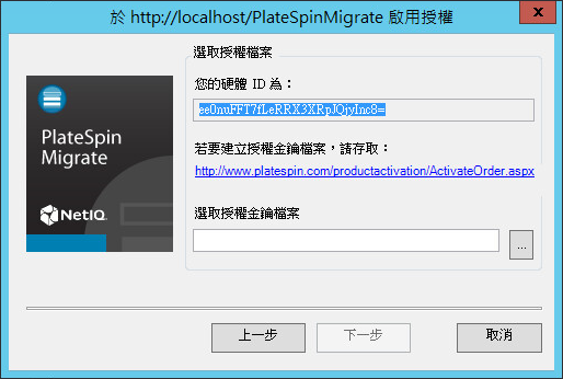 安裝後第一次啟動 PlateSpin Migrate 用戶端時,將會開啟「授權啟用精靈」並提示您啟用產品授權。