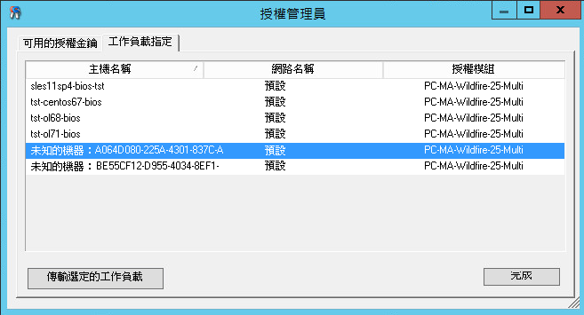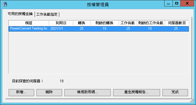 「授權」索引標籤顯示用於工作負載移轉的授權名稱 (模組) 及其啟用碼、到期日和授權數目 (可用的工作負載授權數、已用的工作負載授權數、剩餘的工作負載授權數、可用的轉換次數、已用的轉換次數和剩餘的轉換次數)。