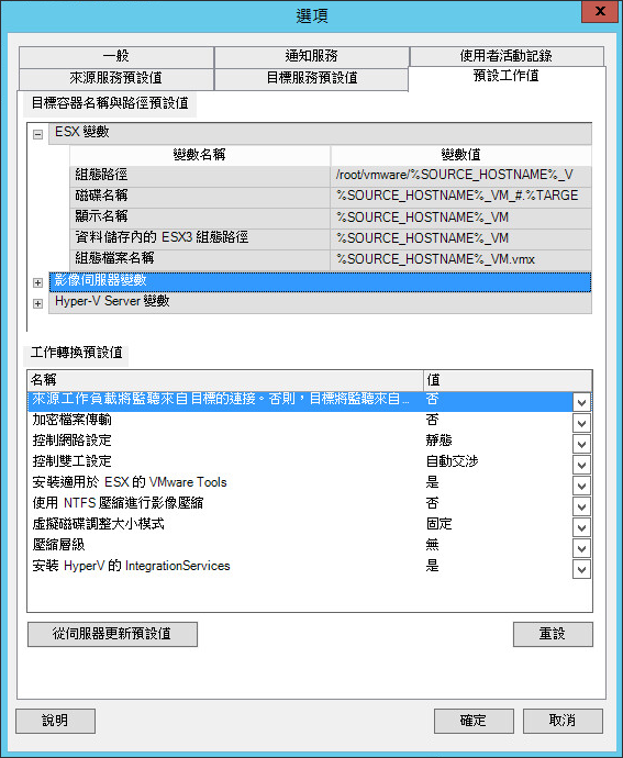 在「工作轉換預設值」區段,為影響所有移轉工作的以下參數設定預設值。執行實際工作負載移轉工作期間所設定的設定值将覆寫這些預設值。