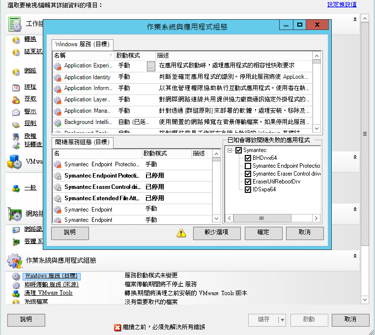 如果您不希望某個 Windows 服務在虛擬化工作負載上繼續執行,請設定工作,以在目標工作負載上停用該服務。
