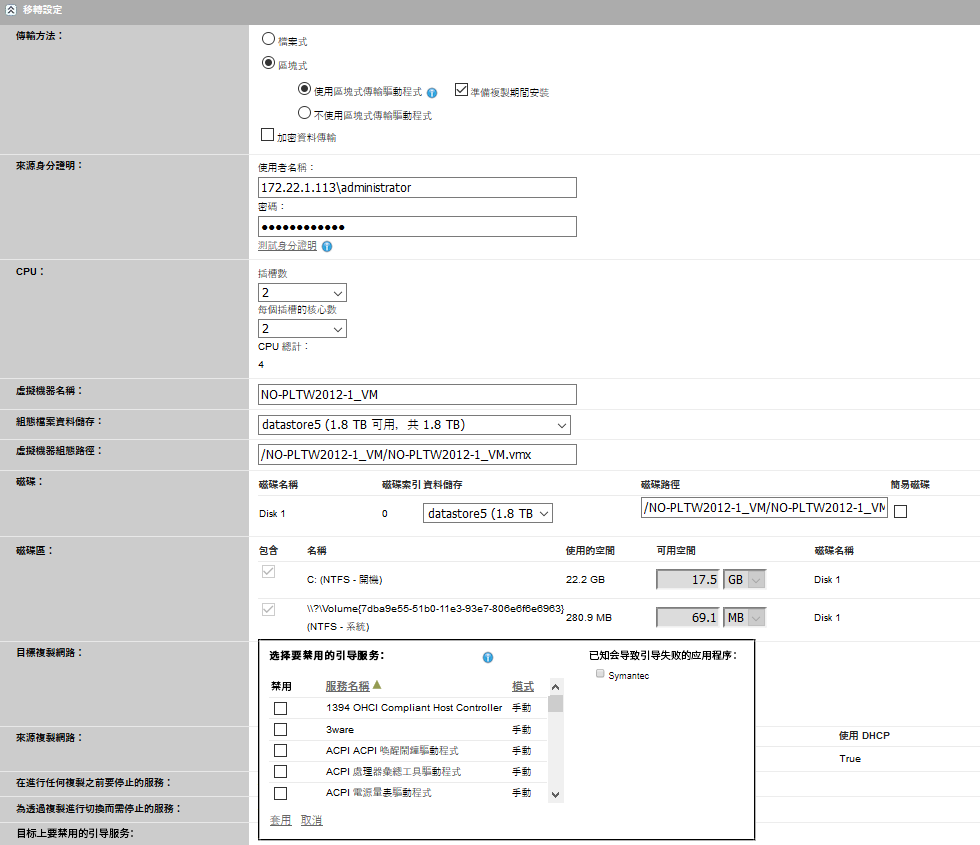 在「編輯移轉詳細資料」中,移至移轉設定 > 目標上要停用的開機服務。