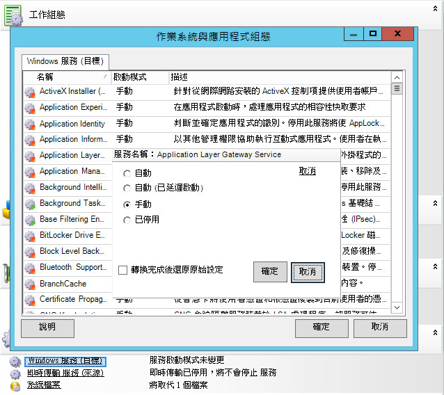 如果您需要目標上的某個服務依據其他某個服務的申請啟動,可將所需服務的啟動模式設定為手動。