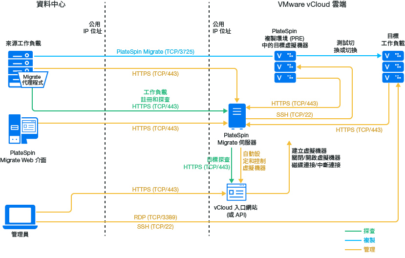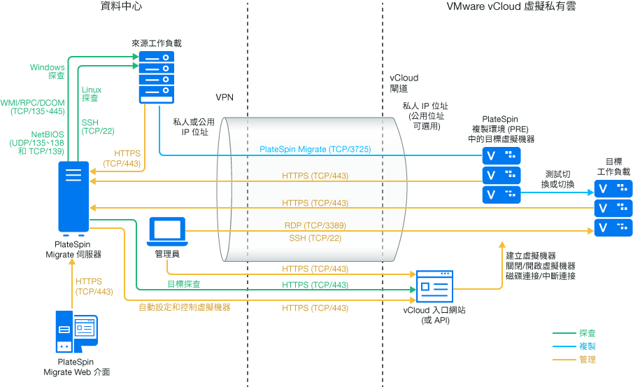 附註:圖 10-1 描述了 Windows 和 Linux 工作負載的自動探查和網路要求。您也可以使用來源工作負載上的 Migrate 代理程式來註冊工作負載,並使用 HTTPS (TCP/443) 將其庫存詳細資料傳送至 PlateSpin Migrate 伺服器。請參閱節 2.6.2, 工作負載註冊的要求 和節 22.7, 使用 Migrate 代理程式註冊工作負載並探查詳細資料。