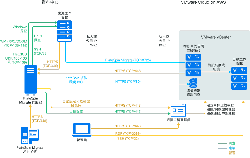 附註:圖 13-1 描述了 Windows 和 Linux 工作負載的自動探查和網路要求。您也可以使用來源工作負載上的 Migrate 代理程式來註冊工作負載,並使用 HTTPS (TCP/443) 將其庫存詳細資料傳送至 PlateSpin Migrate 伺服器。如需使用 Migrate 代理程式時的網路要求,請參閱節 2.6.2, 工作負載註冊的要求和節 22.7, 使用 Migrate 代理程式註冊工作負載並探查詳細資料。