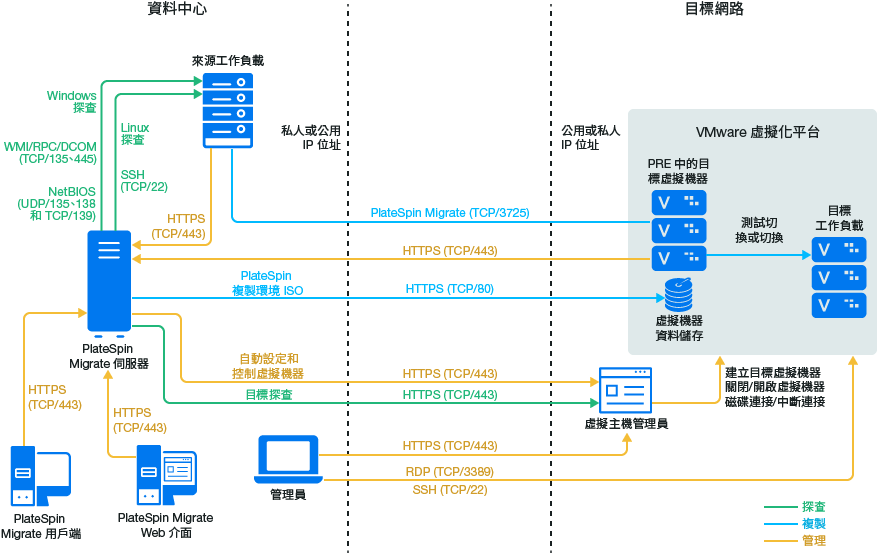 附註:圖 13-1 和圖 13-2 描述了 Windows 及 Linux 工作負載的自動探查和網路要求。您也可以使用來源工作負載上的 Migrate 代理程式來註冊工作負載,並使用 HTTPS (TCP/443) 將其庫存詳細資料傳送至 PlateSpin Migrate 伺服器。請參閱節 2.6.2, 工作負載註冊的要求 和節 22.7, 使用 Migrate 代理程式註冊工作負載並探查詳細資料。