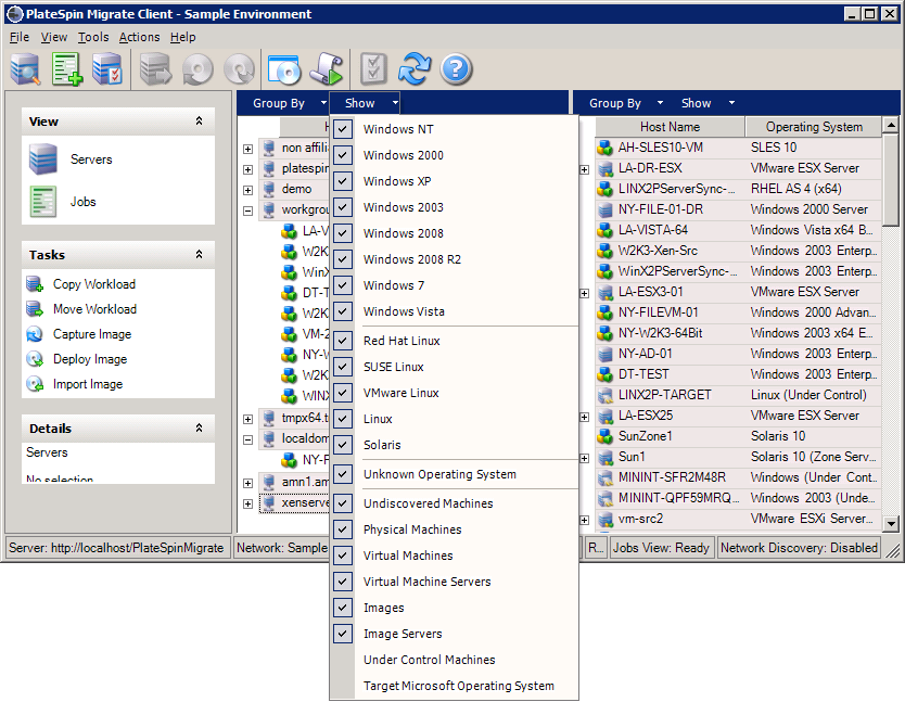 To further control the scope of items shown in either pane of the view, you can also use the Show drop-down menu to filter machines by workload type; for example, Windows Server 2008 R2, Red Hat Linux, and so on, as shown in the figure below: