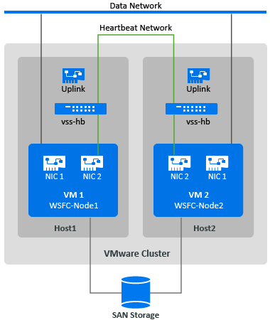 To create a heartbeat network, you can configure vSphere Standard Switches (vSS) identically on each host and add a virtual machine port group for the heartbeat network on each switch. Each host contributes an available NIC to use as the uplink, which is required for communications between nodes across the hosts. You configure the second NIC on each VM to use the heartbeat network.