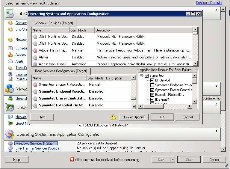 A global setting, ApplicationsKnownForBootFailuresOnTargetDefaultValue, on the PlateSpin Server Configuration page sets whether the services of all such applications listed in the ApplicationsKnownForBootFailuresOnTarget parameter must be selected by default so that the corresponding application services can be disabled on the target during the conversion.