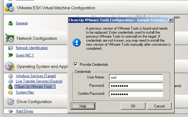 For non-VMware targets: The job configuration interface prompts you to uninstall VMware Tools. Provide the same administrator-level credentials used to install the software. If the credentials are unknown, VMware Tools remains on the target machine after migration.