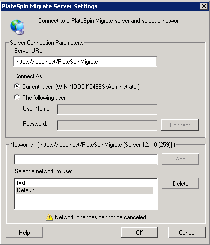 To familiarize yourself with PlateSpin Migrate features, use the Sample Environment network. To work with actual source workloads and targets, use the Default network or create your own. To add a network, type the name, then click Add. To remove a network, select it, then click Delete. |