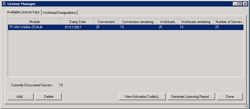 In the PlateSpin Migrate Client, you can view and manage license allocations on the License Manager’s Workload Designations tab.