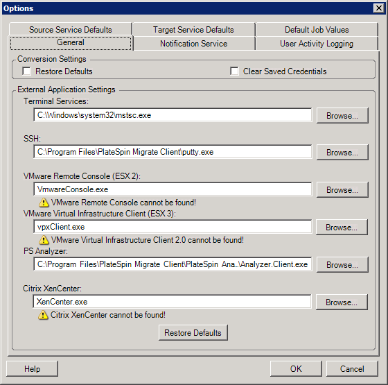 PlateSpin Migrate Client enables you to restore default settings, clear saved credentials, and specify the locations of executable files for external applications that you can launch from within the Client.