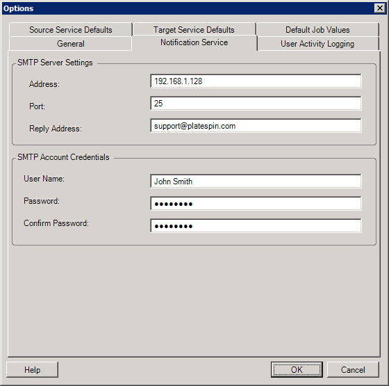 The PlateSpin Migrate Client enables you specify Simple Mail Transfer Protocol (SMTP) server settings for event and job progress notifications.