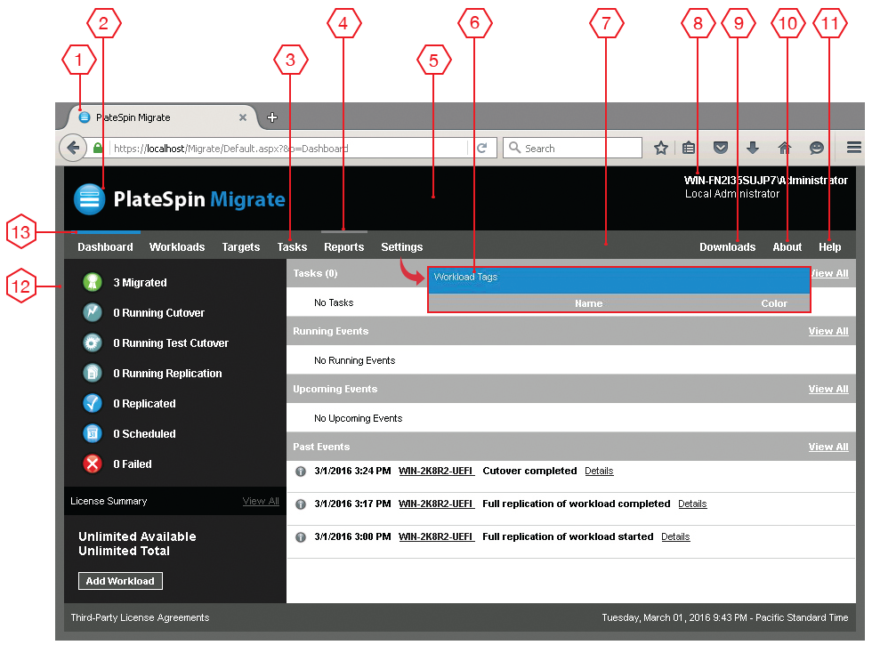 The look and feel of the PlateSpin Migrate Web Interface is consistent across the various pages. The illustration in Figure B-1 of the PlateSpin Migrate Dashboard identifies the elements that you can modify in the Web Interface UI with numbered callouts. For information about the related parameter for each element, see Section B.1.2, Modifying PlateSpin Configuration Settings for Configurable UI Elements.