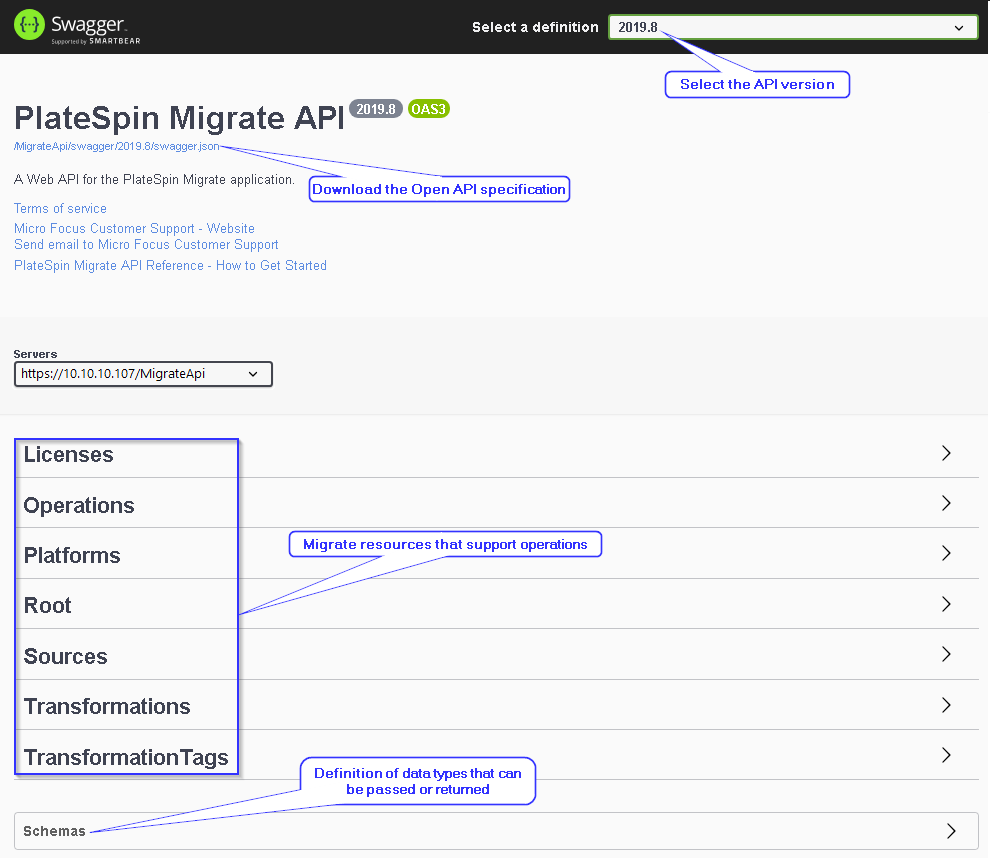 Version 2019.8 is the latest release version of PlateSpin Migrate API. As development continues, we expect breaking changes to require a new release version. When a new version is released, we currently plan to support the prior version for up to one year from that date.