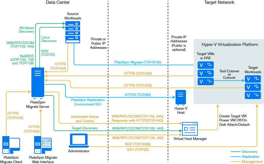 NOTE:Figure 14-1 and Figure 14-2 depict automated discovery and the network requirements for Windows and Linux workloads. You can alternatively use Migrate Agent on the source workload to register the workload and send its inventory details to PlateSpin Migrate server using HTTPS (TCP/443). See Requirements for Workload Registration and Registering Workloads and Discovering Details with Migrate Agent.
