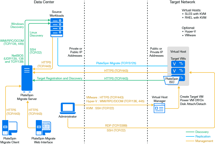 NOTE:Figure 13-1 and Figure 13-2 depict automated discovery and the network requirements for Windows and Linux workloads. You can alternatively use Migrate Agent on the source workload to register the workload and send its inventory details to PlateSpin Migrate server using HTTPS (TCP/443). See Requirements for Workload Registration and Registering Workloads and Discovering Details with Migrate Agent.