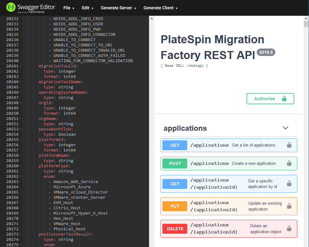A simple example of a Python script to import workloads is available (with annotations) on the PlateSpin Transformation Manager Appliance in the <connector-path>\resources\ folder. It demonstrates how to use the REST APIs for PlateSpin Transformation Manager to import workloads for a single project. All values are sample values. You must replace them with information for your own project. We used Python for the example, but you can use any of the available programming languages supported by the Swagger Editor.