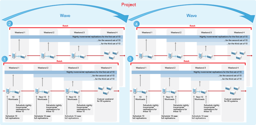Within a wave, batches group like workloads that you want to transform together. Batches can be more easily scheduled during intervals when Network resources are available. You can deliver valuable results in each batch and wave. Schedules are flexible. You can coordinate the start dates and cutover dates with stakeholders to work around planned events that are critical to the business.