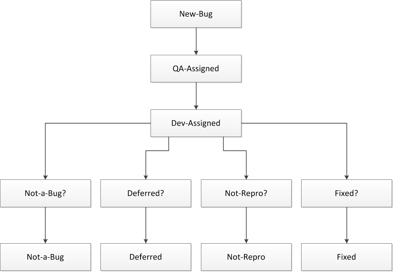 Of course, these are only the developer’s claims and have yet been verified. Your workflow model might reflect these claims with the following states: Fixed?, Deferred?, Not Repro?, and Not-a-Bug? The question marks imply that these claims have not yet been verified by a QA engineer.