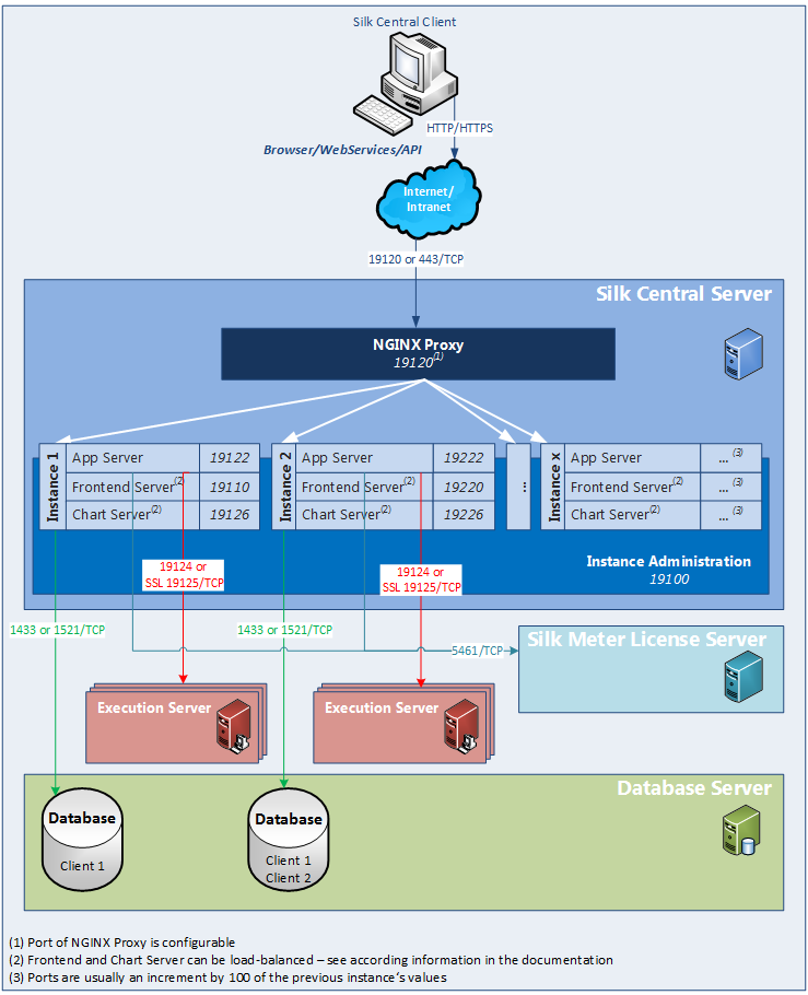 A proxy service is installed on the Silk Central server to control the access to the different instances. The services of each instance run on dedicated ports, but for security and increased flexibility reasons, the proxy routes the instance name to the actual URL in the form of http://<Silk Central server>:19120/<instance name>.