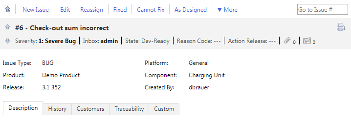 | 履歴 | 問題に関するすべての変更を追跡します。例:問題が作成された時期、その作成者、再割り当て、修正、検証などのアクション、顧客、ファイル、テストケースの追加など。 |